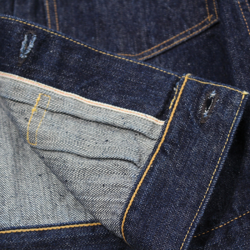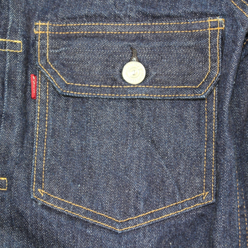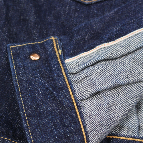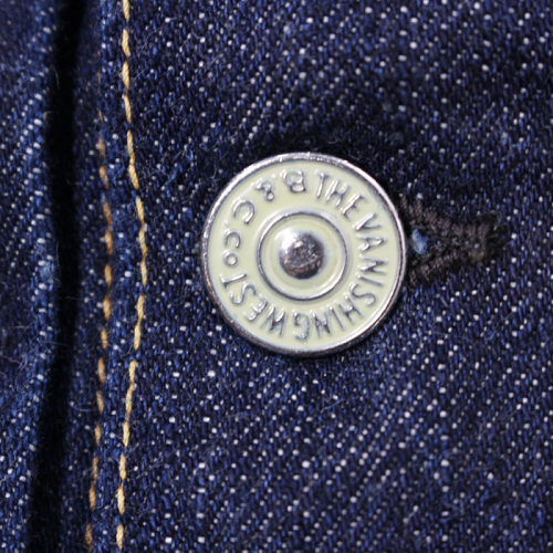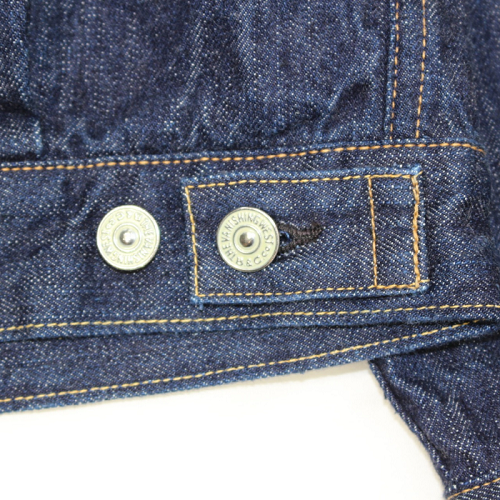 "Lot 601 XX" 51 MODELと同じ年代となり、生地や付属パーツ類は同様の物が使用されています。鉄製タックボタンは白塗装の刻印ボタンをオリジナルで製作。両面ピスネーム、革パッチ、打ち抜き両刻印の銅リベット、オレンジとイエローの綿糸を使用しています。