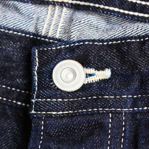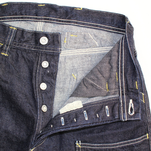 フロントはボタンフライになり、ボタン取り付けは「ONE PIECE FLY」と言い、一枚の生地による物であると示されております。フロントポケットのスレーキには黒の杢シャンブレーを使用しております。スレーキ裾には破れ防止の為、二重構造の仕様で耐久性にも十分な配慮が見受けられます。