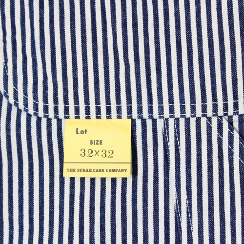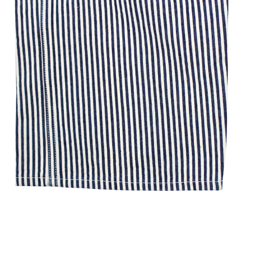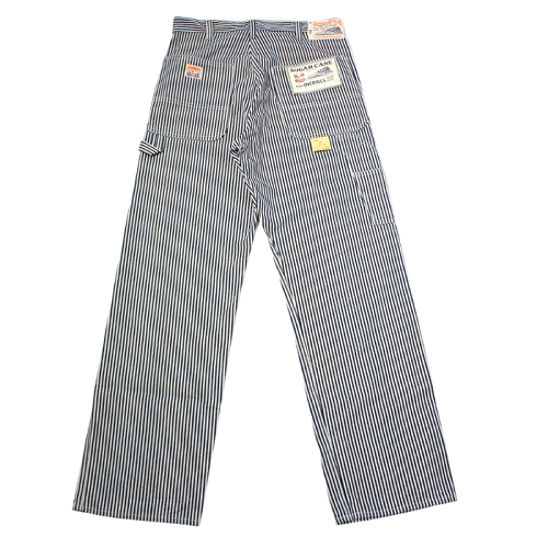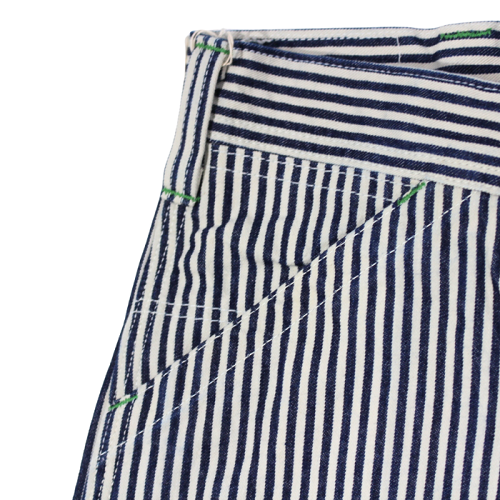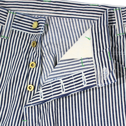 ヴィンテージ同様、旧式のシャトル織機で織り上げたハリのある11オンスのヒッコリーストライプ生地のワークパンツ。ストライプ柄のネイビーの部分はロープ染色したインディゴであり、経年変化でデニムのように褪色。長年着用を繰り返すことでエイジングにも期待できる。
