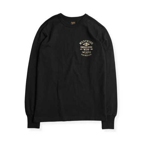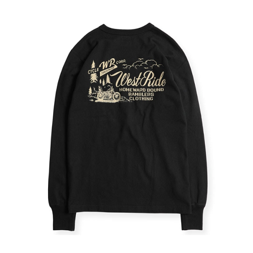 バイクと山々、そして空と道。「帰る場所=家路」を探して彷徨うRAMBLERSをアウトドア調のグラフィックでまとめたPSYCHO氏による新作。シーズンキーワード「HOMEWARD BOUND」、そして風を射るARROW=弓とともに、WESTRIDEの原点であるテキサス州の街FORT WORTHの名が刻まれている。