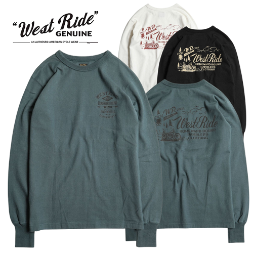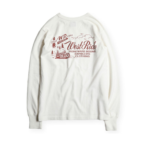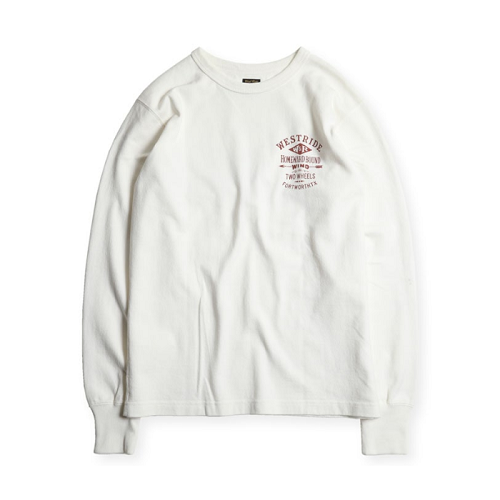 縫製:WESTRIDEのオリジナルL/S TEEは、丸胴の吊り機で編み立てる→サイドを割ってダブルシームで縫製→内側サイドの縫い代をカット→ネックはトリプルバインダー。と非常に手間のかかる仕上げとなっている。この工程により、丸胴に見られるヨジレなどの型崩れもなく、肌触りも良好となる。製品としての安定した品質を実現している。8番の単糸ではなく、16番双糸を使用することで生地に取り込むことのできる空気の層を増し、着用感をより高いものにしている。肌着としての側面も持つTEE類だけに、プリント柄だけでなく、品質そのものに拘って生産しています。