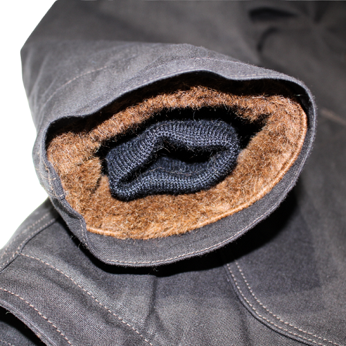 表地にコットン100%のオリジナルコットンダックドライフィッシュファブリック、インターライニングにコットン100%のヘビーネルファブリック、裏地にアルパカ100%を使用した3層構造