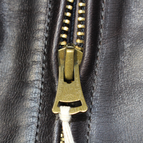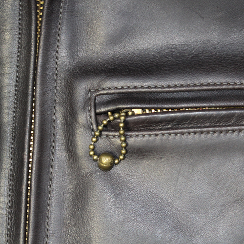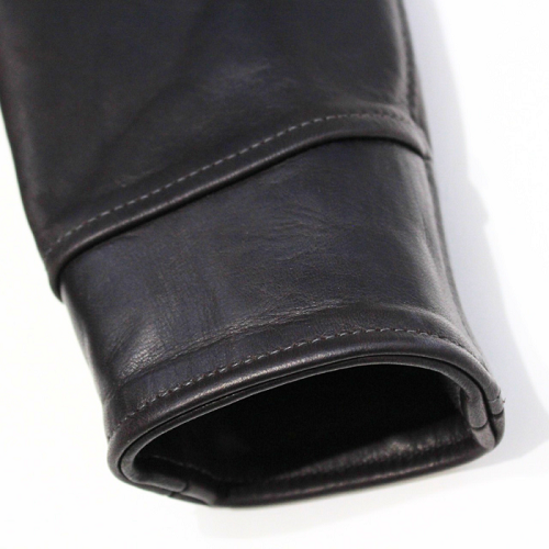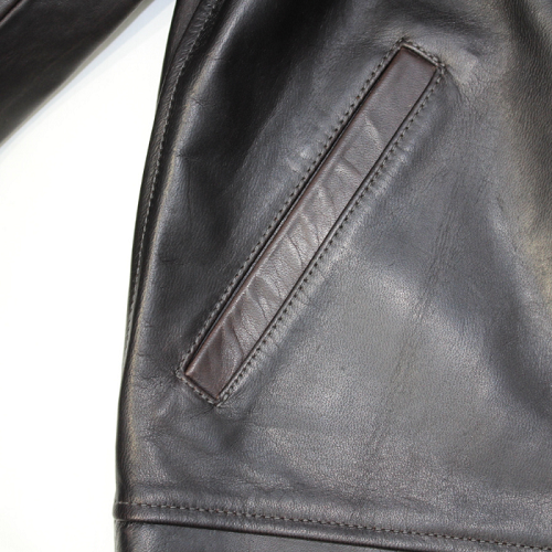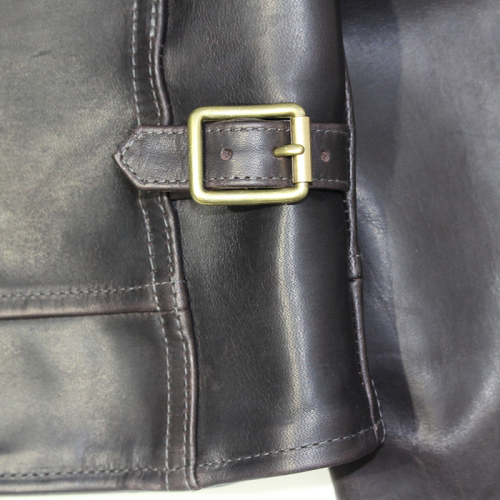 黒染料とパラフィンフィニッシュを施した茶芯のレザーは、着込むほどにグラデーションのような味わい深い変化を楽しめます。
