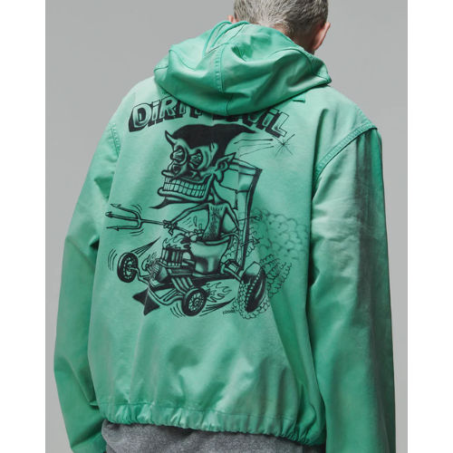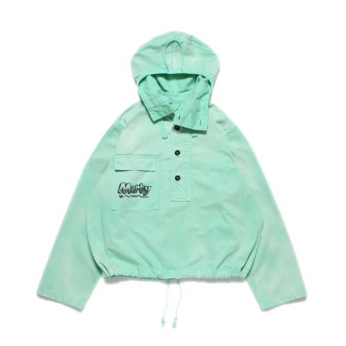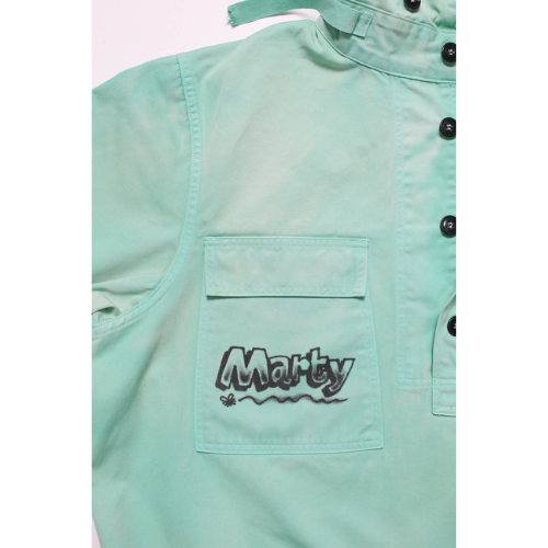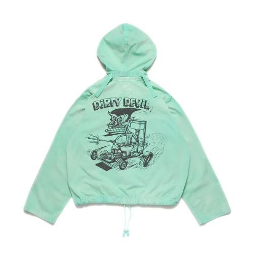 1940年代のUS NAVYが甲板で使用していたサルベージ防寒具をモチーフにしたパーカーのスタンドヘンリーネック仕様初期型タイプ。当時、部隊ごとに染め分けられたパーカーは、独特の退色感と雰囲気を持ち、ヴィンテージラバーに愛される異様なオーラを放っている。軍での使用を終えた後、払下げられたパーカーはロウブローアーティストのキャンバスや、チームウェアとして使用されることもあり、時おりスーパービンテージとして発見されることがある。 このアイテムは、そのような歴史的背景をイメージし、ロウブローアーティスト「SKETCH」に依頼。SKETCHがイメージする色で染められ、デビルモンスターエアブラシデザインが施されたスペシャル仕様。