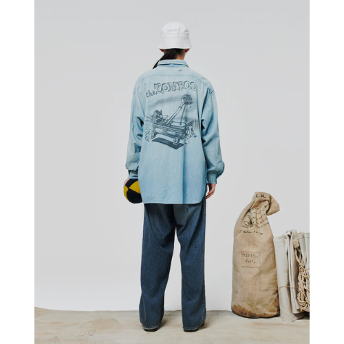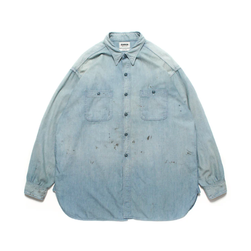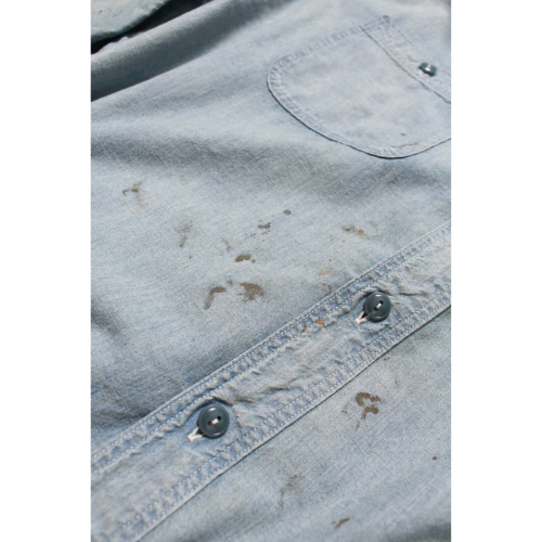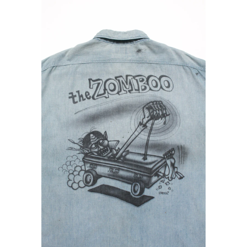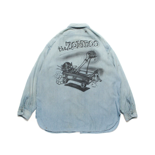 1940年代のUS NAVY兵士が日常作業や甲板作業、整備作業などで着用していたシャンブレーシャツ初期タイプ。ビンテージシャンブレーシャツは、ワークシャツでも多く見受けられるが、US NAVYものは別格であり、甲板作業で日焼けし、汚れたその様子は、ワークシャツとは異なる独特の雰囲気を放っている。軍での使用を終えた後、家に持ち帰った兵士が愛するロウブローアーティストにエアブラシを吹き付けてもらったというエピソードに基づいて製作された。 この物語をイメージし、ロウブローアーティスト「SKETCH」に依頼して仕上げた本作は、ゾンビモンスターデザインが施されたスペシャル仕様。
