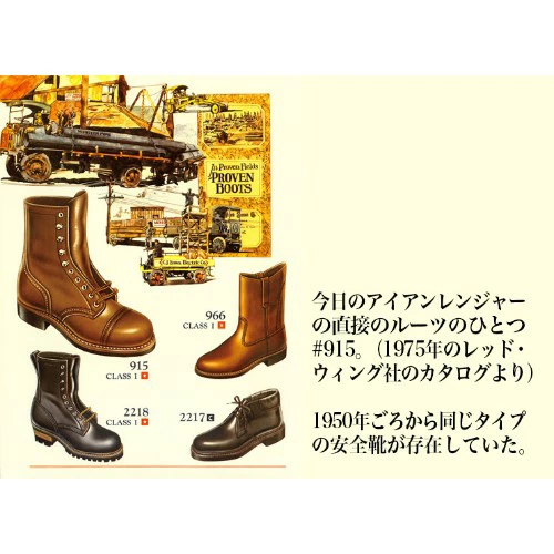 この「キャップドトゥ」は20世紀初頭のワークブーツには幅広く採用されたデザインでもあり、創業間もない時期のレッド・ウィング社のカタログ(1910年のもの)を見ると、掲載されている37型のワークブーツの内33型がキャップドトゥのデザインとなっています。時代が流れ、現在の安全靴の標準仕様であるスティールトゥが普及するとともにキャップドトゥのブーツは減っていきましたが、一部のスティールトゥのブーツは当時のつま先保護・補強のための仕様であるキャップドトゥのデザインを1990年代まで保っていました。そうして今日に受け継がれたキャップドトゥのデザインをリファインしたものがアイアンレンジャーです。