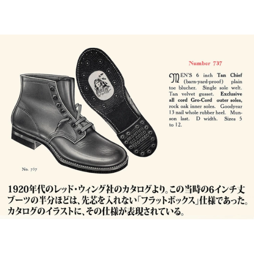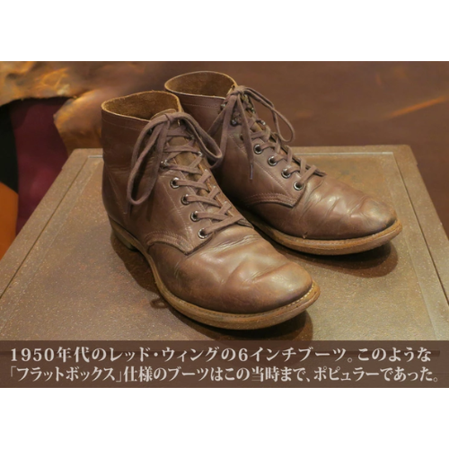 「フラットボックス」仕様のブーツは1960年代前半までよく見られました。その当時は#877のような先芯を入れる設計のブーツが「フラットボックス」仕様でつくられる事もよくあり、その履き心地を求める顧客からの特別な要望を受けてレッド・ウィング社が特別に仕様を変えてつくっていたようです。