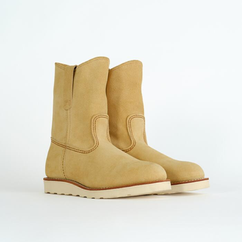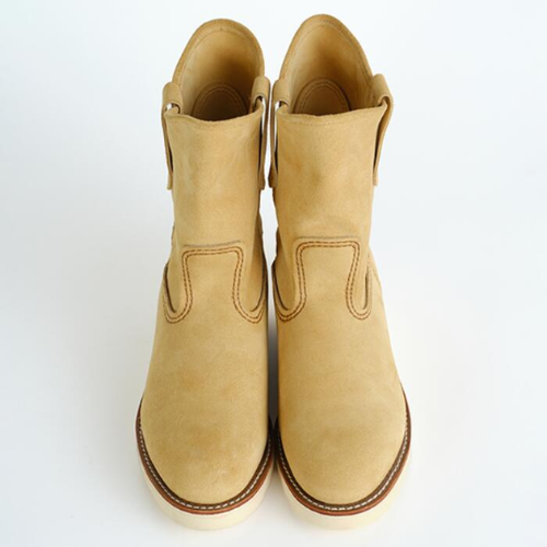 ペコスブーツはレッドウィング社の開発した、ウエスタンブーツタイプのワークブーツです。元々スペインの乗馬靴に由来するウエスタンブーツは、左右両側に縫い目のあるサイドシームの筒を持つプルオンブーツで、その多くはつま先がやや尖った形をして高めのヒールがついています。これは乗馬の際に鐙(あぶみ)にスムーズに足を入れて踏ん張るのに適していたからです。