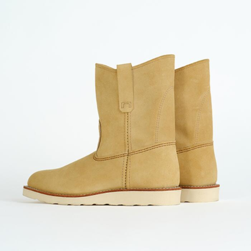 レッドウィング社はかつてテキサスに拠点を持ち、1930年代にはウエスタンブーツも販売していました。このウエスタンブーツにレッドウィング社が得意とする機能本位のワークブーツのデザイン手法を用いて、シンプルかつ頑丈で様々なワークに使えるブーツとしたものがペコスブーツです。