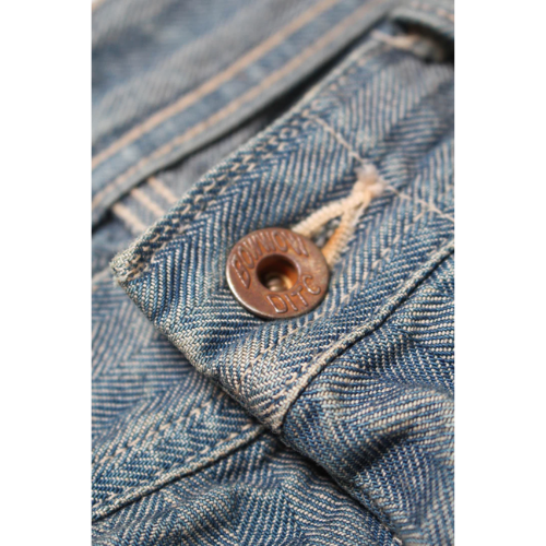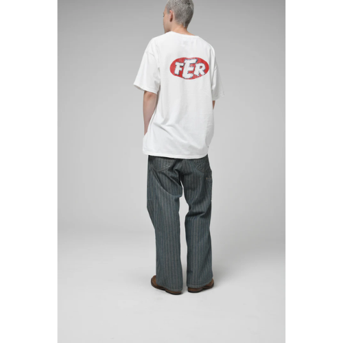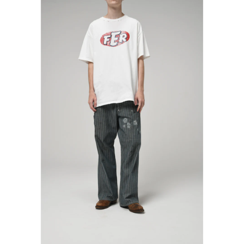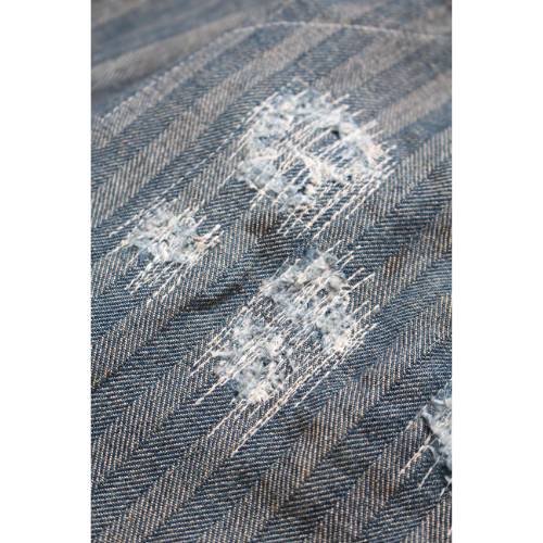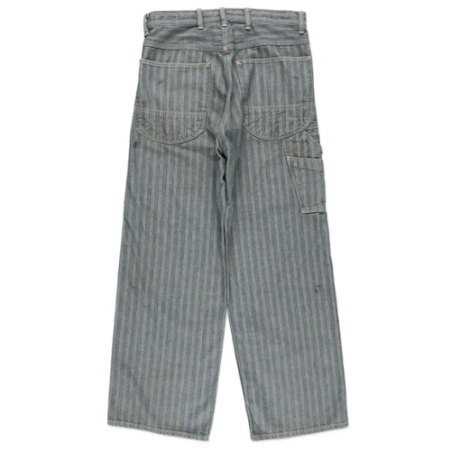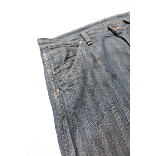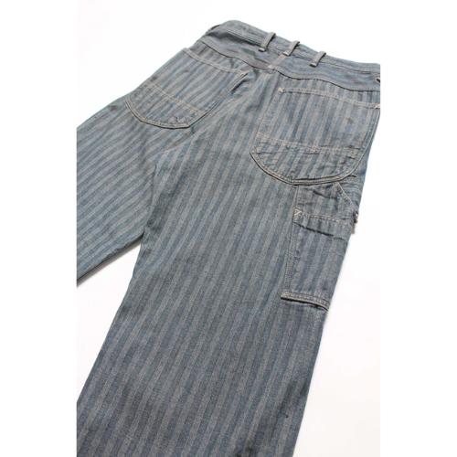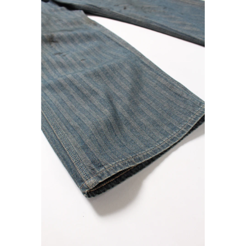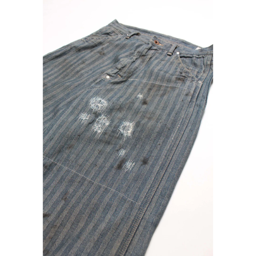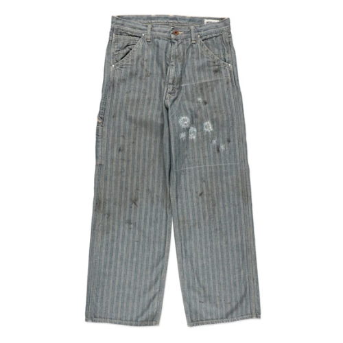 40〜50年代に見られるワークパンツの代表的なディティールを踏まえ、当時の無骨な構造とシルエットバランスをそのまま活かした一本。インディゴヘリンボーンならではの表情と、古い時代のワークウェアらしい実用性の匂いを残している。 リペアを繰り返しながら履き続けられてきた様子をイメージし、補修痕や擦れた表情までリアルに表現。オイル汚れや黒ずみなど、モーター関連企業の現場を思わせる汚れ加工を重ね、ガレージワークの空気感を色濃く残した仕上がりになっている。