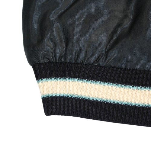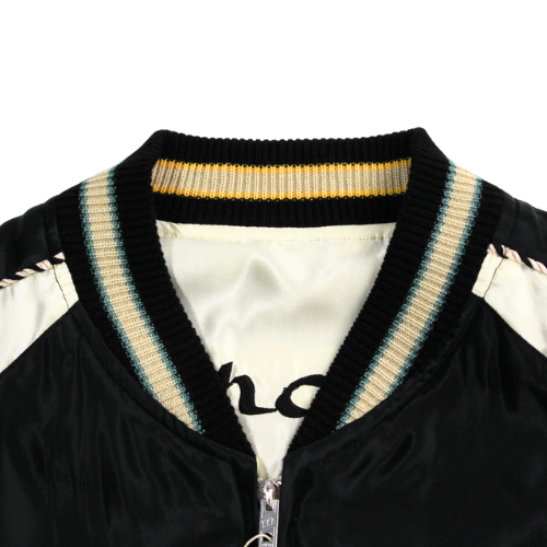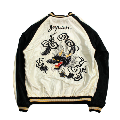 スーベニアジャケットのなかで最もスタンダードな両面にアセテート生地を使ったリバーシブルタイプ。戦後当時のスカジャンには、シルクに似た高級感を持つ物資統制外品目のアセテートが使われていた。中綿がないため季節を問わず着用でき、独特なドレープ感も魅力といえる。