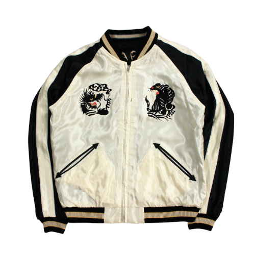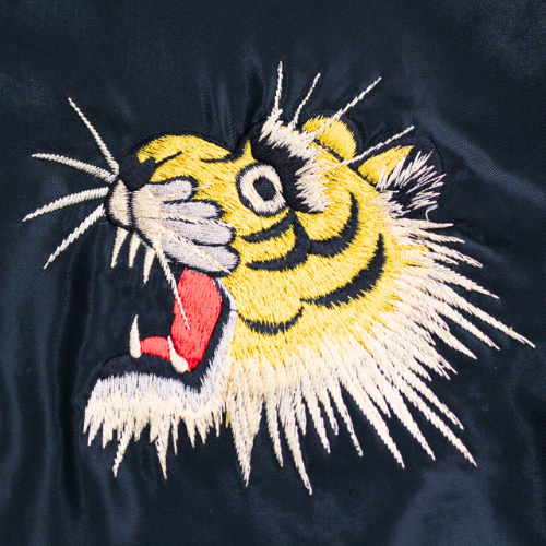 1950年代中期の作品をもとに刺繍の針足を駆使して虎の毛並みや筋骨隆々とした体躯を写実的に表現しており、黒いサテン生地に際立つコントラストの強い配色で、迫り来るような迫力を持った躍動感あふれる仕上がりとなっている。背中のJAPANの文字はヴィンテージでも人気の高いオリエンタルなフォントを再現。