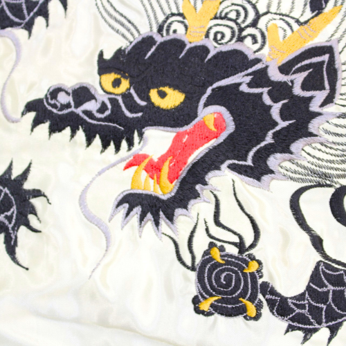 リバーシブル面は、長い胴体を雲間に隠しながら大空を浮遊する龍の絵柄。ブラックを基調とした単色の刺繍だが、顔と鱗の縁取りにグレーの色糸を重ねることで立体感を強調している。風にたなびく龍の鬣(たてがみ)は細いラインの横振り刺繍で繊細に描写。
