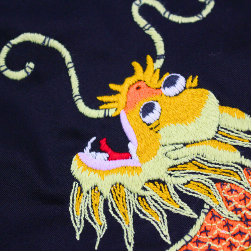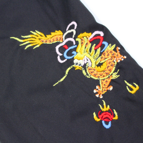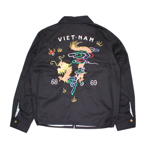 1960年代後期(1968~69年)にベトナムへ駐留していた米兵がオーダーし、アメリカへ持ち帰った一着。マップ柄が主流のベトジャンにおいて、このドラゴンの刺繍は非常に希少である。龍柄のヴィンテージはいくつか確認されているが、これほどカラフルで迫力のある刺繍は他に類を見ない。背中の龍も袖の龍も多色の色糸を駆使して描写されており、当時も高い技術を持つ職人が手掛けていたことが窺える。左胸の「福」の文字は通常よりもやや小さいが、2色の色糸を使いヴィンテージに準じたバランスで再現している。