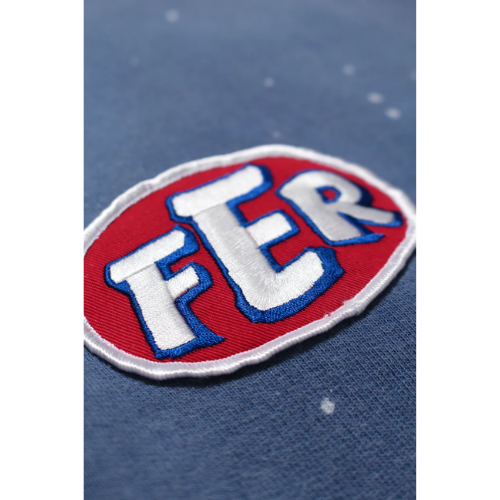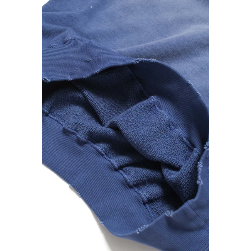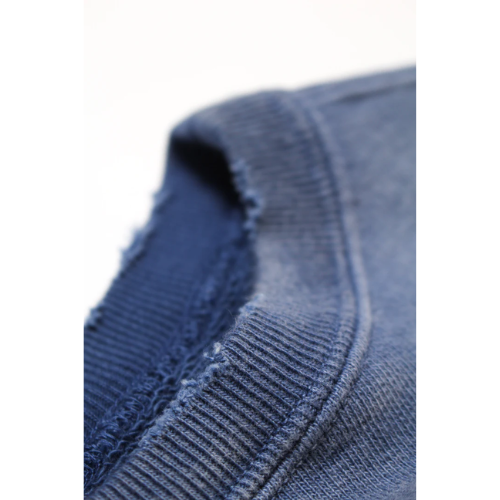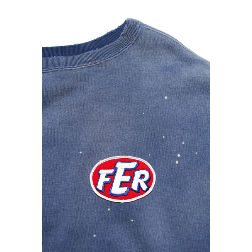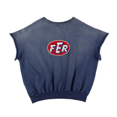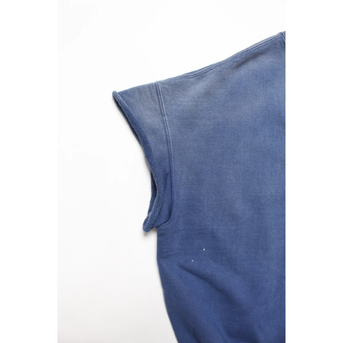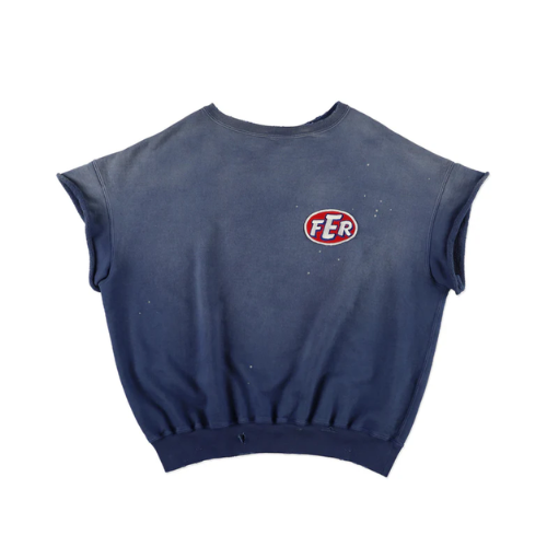 モーター関連メーカーをイメージしたロゴパッチを配し、工業的で力強いムードを加えた半袖スウェット。ガレージユニフォームのような佇まいを意識し、無骨で実用的な空気感を前面に出している。 1950〜60年代にクルースウェットの袖をカットオフして着用されていた個体を背景に、そのラフな改変を一つのスタイルとして捉えたデザイン。現場で生まれたリアルなバランスをそのまま落とし込んでいる。 起毛無しの厚地裏毛を使用し、古い時代の質感と実用性をそのまま残し、リアルな加工表現もデザインとしている。